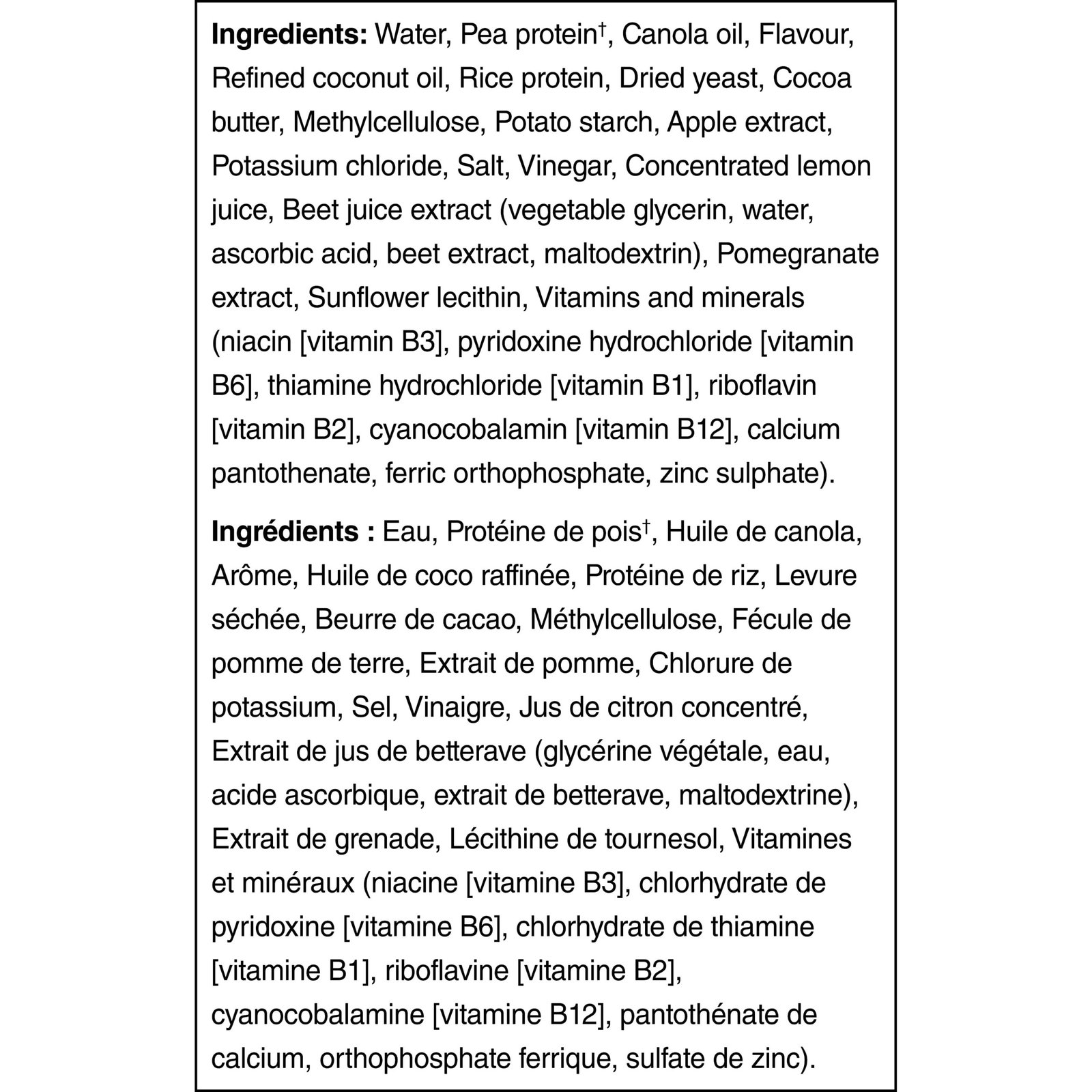 | Ingredients | Water. Pea protein*. Canola oil. Refined coconut oil. Casing (sodium alginate. calcium chloride. smoke flavour. guar gum. lactic acid). Flavour. Dried yeast. Rice protein. Chicory root inulin fibre. Yeast extract. Seasoning. Methylcellulose. Salt. Potassium chloride. Vinegar. Concentrated lemon juice. Sugars (apple extract. pomegranate extract). Psyllium husk fibre. Pea fibre. Sunflower lecithin. Beetroot powder. Carrot powder. Vitamins and minerals (niacin [vitamin B3]. pyridoxine hydrochloride [vitamin B6]. thiamine hydrochloride [vitamin B1]. riboflavin [vitamin B2]. cyanocobalamin [vitamin B12]. calcium pantothenate. zinc gluconate. ferric orthophosphate). |