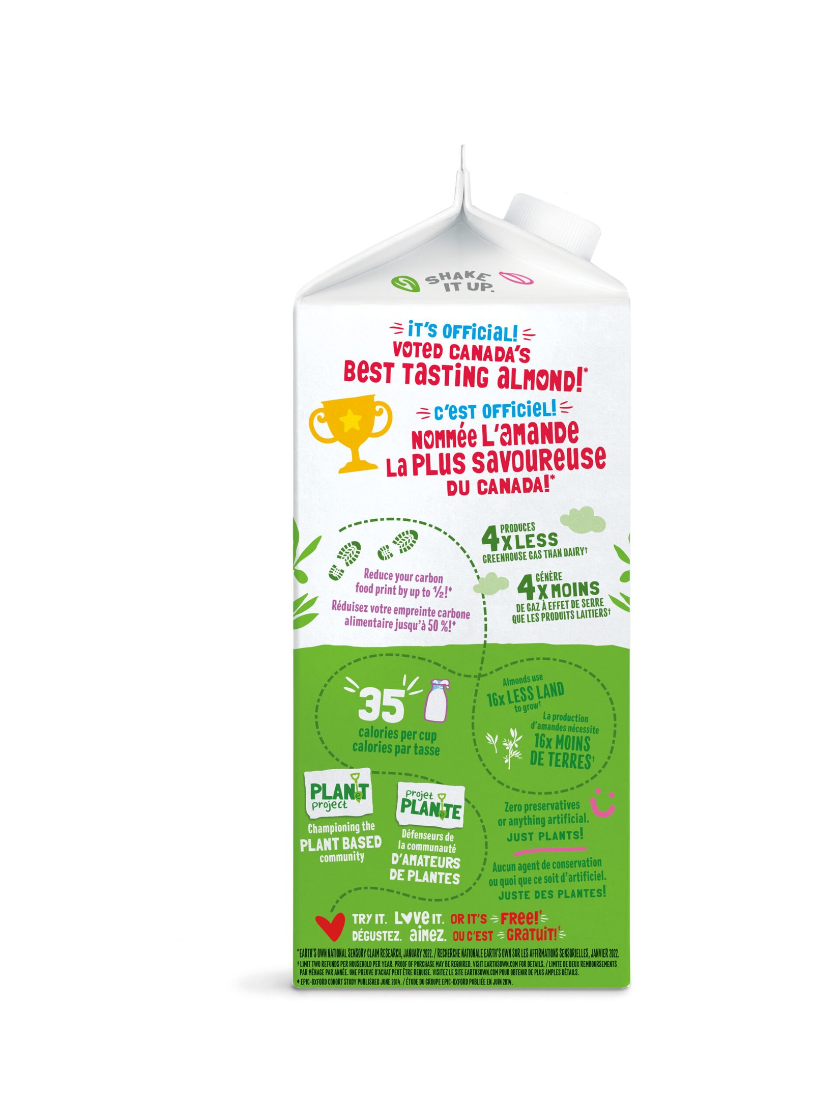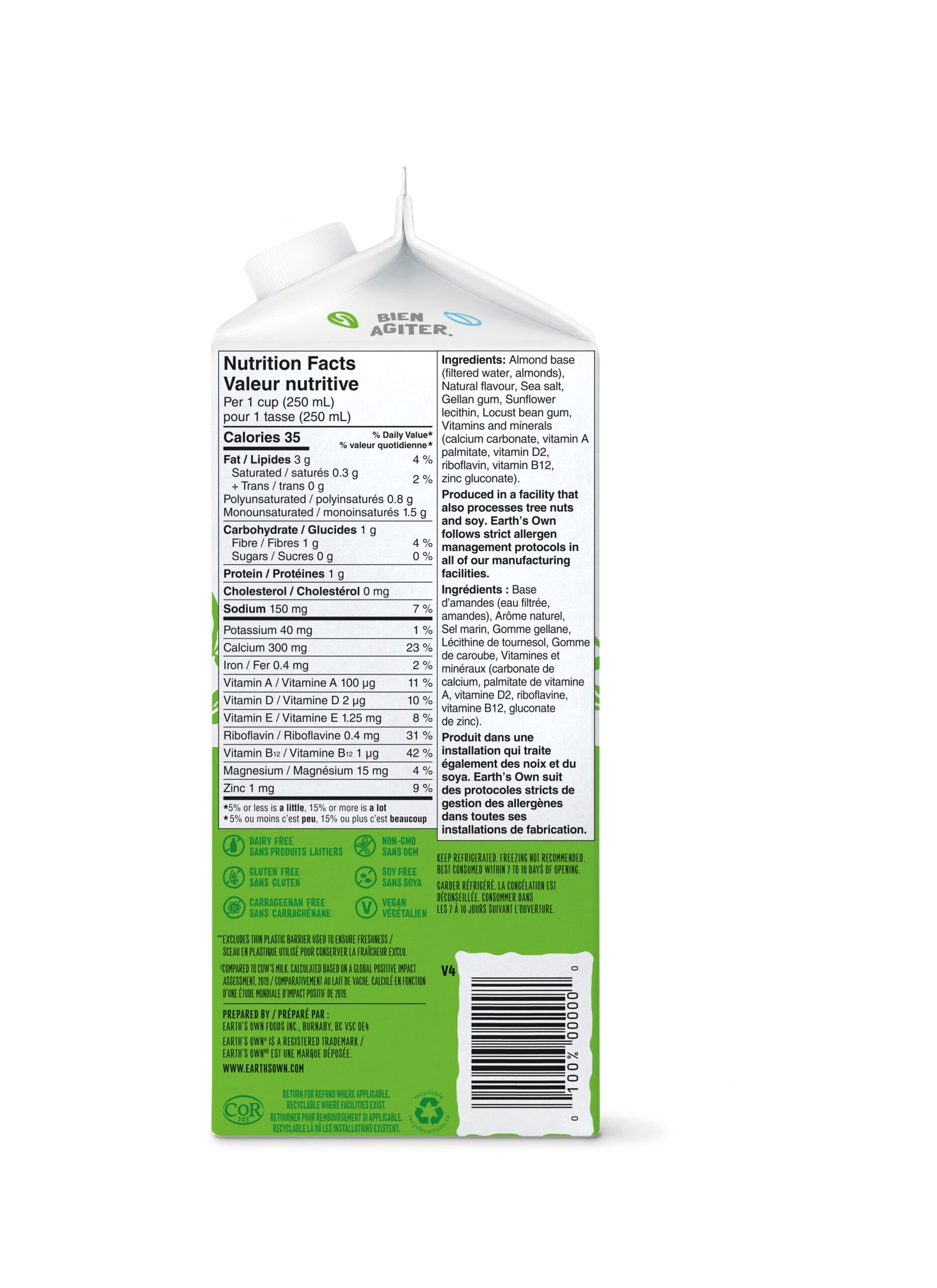 | Fabric Property | NON-GMO VEGAN FRIENDLY GLUTEN FREE DAIRY FREE SOY FREE CARRAGEENAN FREE 35 CALORIES PER SERVING EXCELLENT SOURCE OF CALCIUM AND VITAMIN D NON-GMO PROJECT VERIFIED EVEN OUR CARTON IS MADE FROM PLANTS |