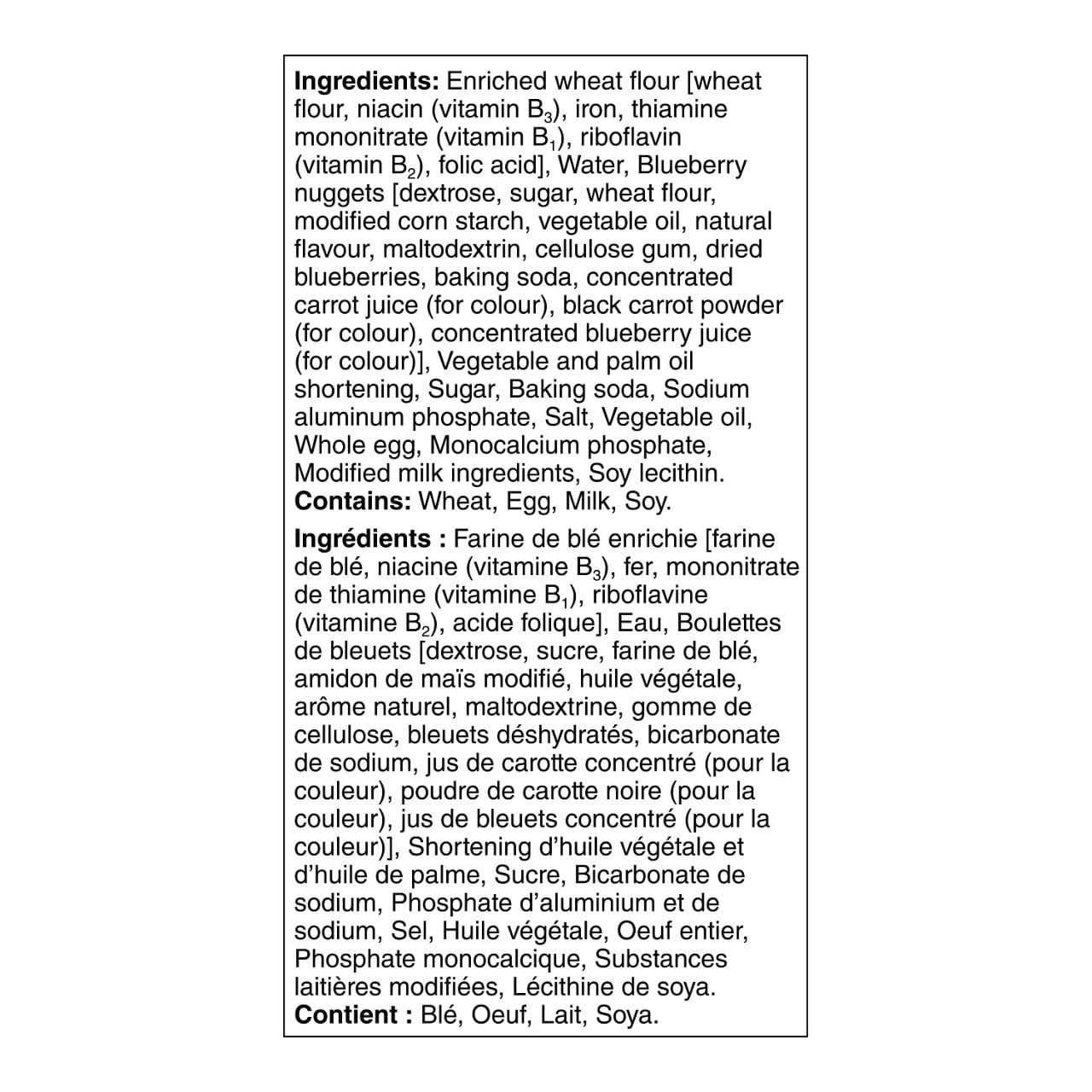 | Ingredients | Water. Wheat Flour. Blueberry Nuggets (Dextrose. Sugar. Wheat Flour. Modified Corn Starch. Colour. Vegetable Oil. Dried Blueberries. Natural Flavour. Maltodextrin. Cellulose Gum. Mono- And Diglycerides. Baking Soda). Vegetable And Palm Oil Shortening. Whole Egg. Baking Powder. Sugar. Salt. Vegetable Oil. Modified Milk Ingredients. Soy Lecithin. CONTAINS WHEAT. EGG. MILK AND SOY INGREDIENTS. |