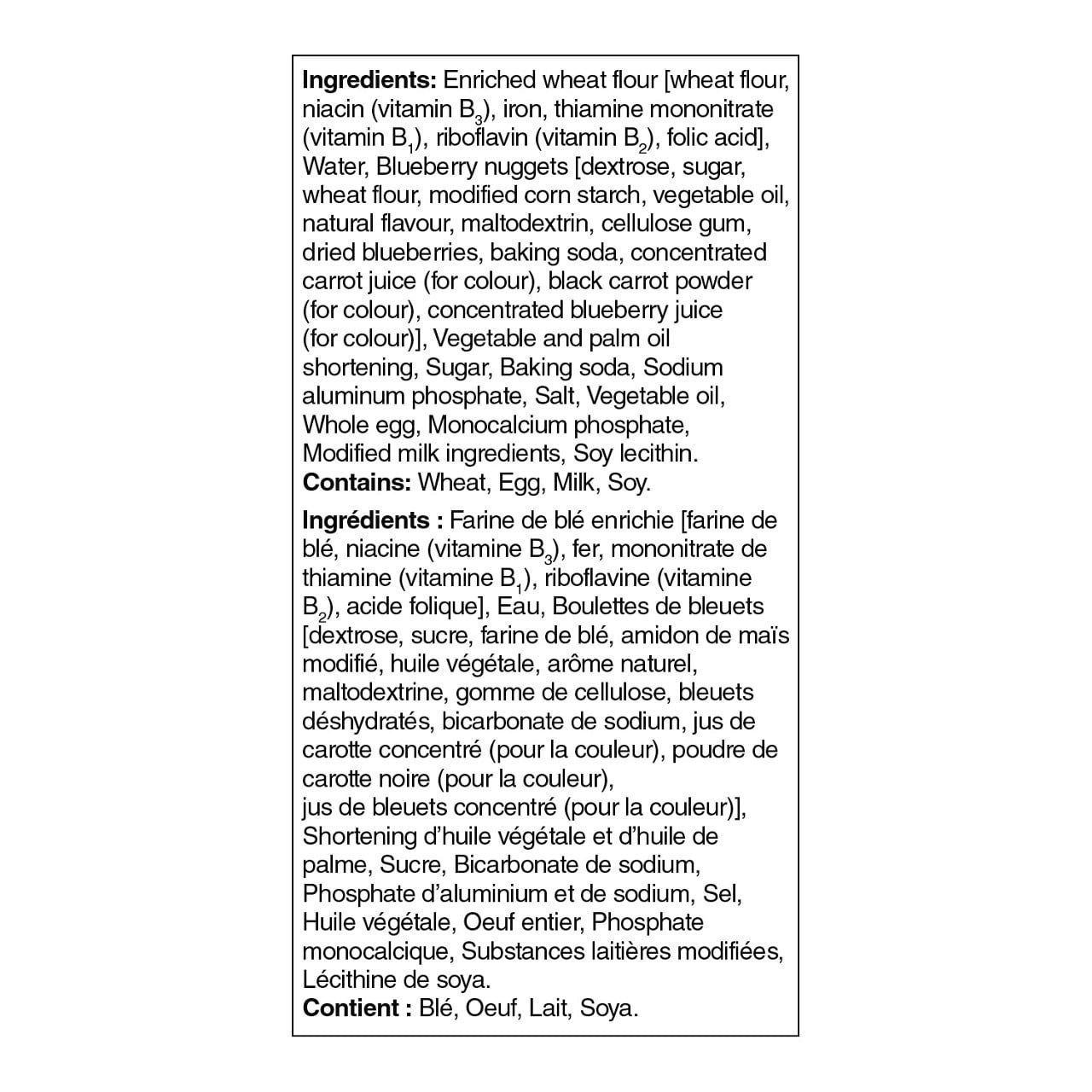 | Ingredients | Water. Wheat Flour. Blueberry Nuggets (Dextrose. Sugar. Wheat Flour. Modified Corn Starch. Colour. Vegetable Oil. Dried Blueberries. Natural Flavour. Maltodextrin. Cellulose Gum. Mono- And Diglycerides. Baking Soda). Vegetable And Palm Oil Shortening. Whole Egg. Baking Powder. Sugar. Salt. Vegetable Oil. Modified Milk Ingredients. Soy Lecithin. CONTAINS WHEAT. EGG. MILK AND SOY INGREDIENTS. |