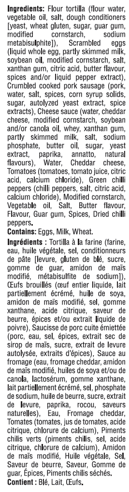 | Ingredients | Flour tortilla (flour water. vegetable oil. salt. dough conditioners (yeast. wheat gluten. sugar. guar gum. modified conrstrarch. sodium metabisulphite). Scrambled eggs (liquid whole egg. partly skimmed milk. soybean oil. modified cornstarch. salt. zanthan gum. citric acid. butter flavour. spices and/or liquid pepper extract). Crumbled cooked pork sausage (pork. water. salt. speices. corn syrup solids. sugar. autolyzed yeast extract. spice extracts). cheese sauce (water. cheddar cheese. modified cornstarch. soybean and/or canola oil. whey. xanthan gum. partly skimmed milk. salt. sodium phosphate. butter oil. sugar. yeast extract. paprika. annatto.natral flavours). water. Cheddar cheese. Tomatoes (tomatoes. tomato juice. citric acid. calcium chloride). Green chili peppers (chili peppers. salt. citric acid. calcium chloride). Modified cornstarch. vegetable oil. salt. butter flavour. flavour. guar gum. spices. Dried Chilli peppers. Contains: Eggs. Milk. Wheat |