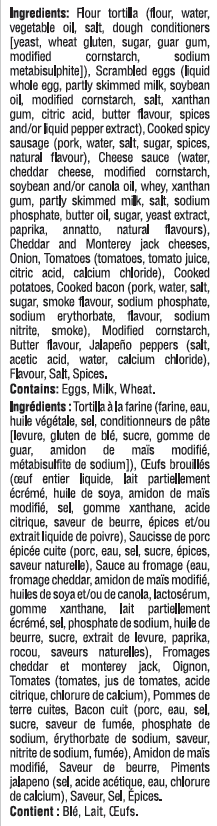 | Ingredients | Flour tortilla (flour. water. vegetable oil. salt. dough conditioners (yeast. wheat gluten. sugar. guar gum. modified cornstarch. sodium metabisulphite). scrambled eggs (liquid whole egg. partly skimmed milk. soybean oil. modified cornstarch. salt. xanthan gum. citric acid. butter flavour. spices and/or liquid pepper extract). cooked spicy sausage (pork. water. salt. sugar. spices. natural flavour). Cheese sauce (water cheddar cheese. modified cornstarch. soybean and/or canola oil. whey. xanthan gum. partly skimmed milk. salt. sodium phosphate. butter oil. sugar. yeast extract. paprika. annatto. natural flavours). cheddar and Monterey jack cheeses. onion. tomatoes (tomatoes. tomato juice. citric acid. calcium chloride). cooked potatoes. cooked bacon (pork. water. salt. sugar. smoke flavour. sodium phosphate. sodium erythorbate. flavour. sodium nitrite. smoke). Modified cornstarch. Butter flavour. Jalapeno peppers (salt. acetic acid. water. calcium chloride). Flavour. Salt. Spices Contains: Eggs. Milk. Wheat |