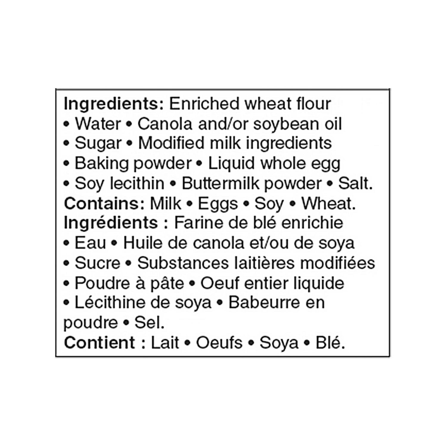 | Ingredients | Enriched wheat flour • Water • Canola and/or soybean oil • Sugar • Modified milk ingredients • Baking powder • Liquid whole egg • Soy lecithin • Buttermilk powder • Salt.Contains: Milk • Eggs • Soy • Wheat. |