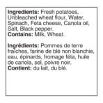 | Ingredients | Fresh potatoes. Unbleached wheat flour. Water. Spinach. Feta cheese. Canola oil. Salt. Black pepper. |
