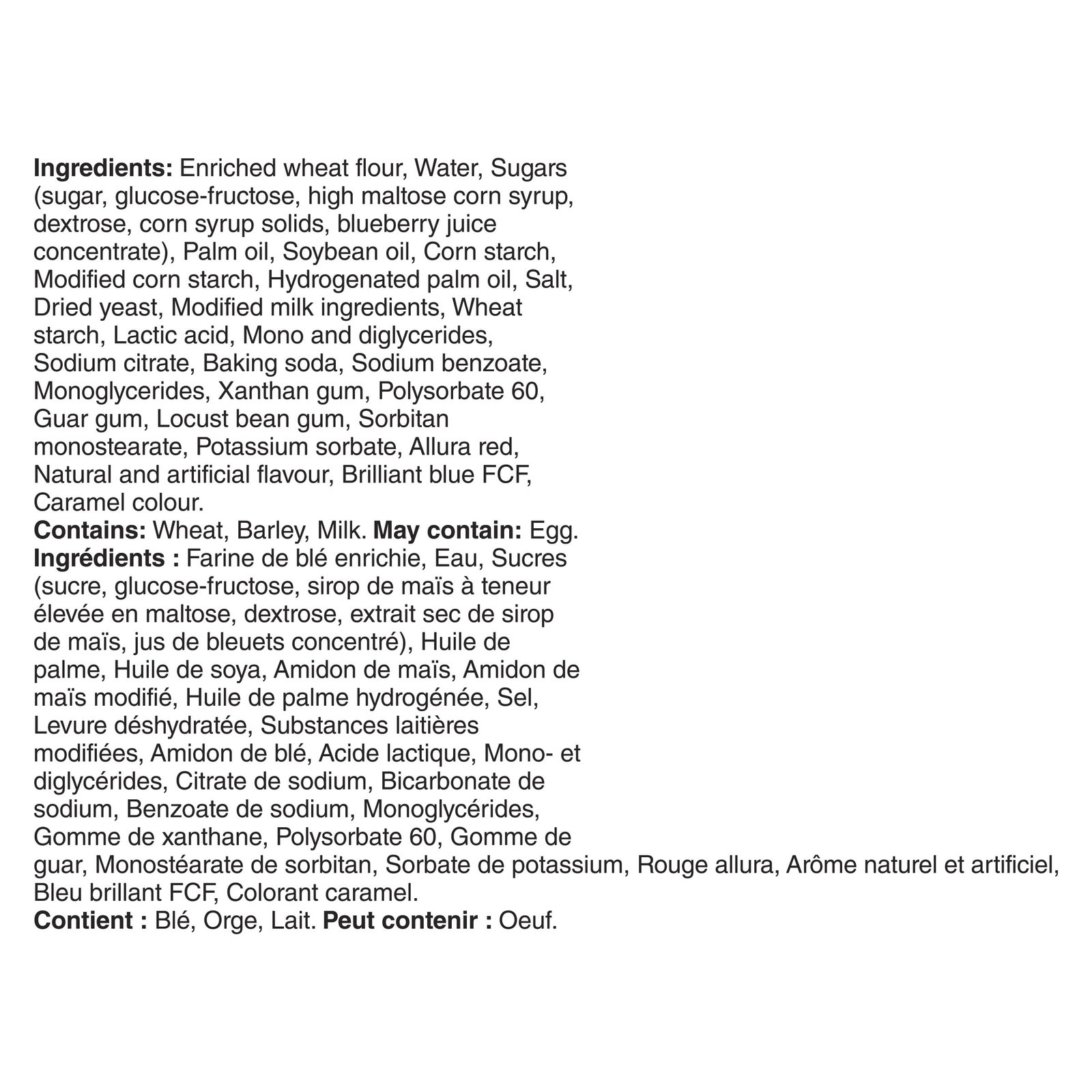 | Ingredients | Enriched wheat flour. Water. Sugars (sugar. glucose-fructose. high maltose corn syrup. dextrose. corn syrup solids. blueberry juice concentrate). Palm oil. Soybean oil. Corn starch. Modified corn starch. Hydrogenated palm oil. Salt. Dried yeast. Modified milk ingredients. Wheat starch. Lactic acid. Mono and diglycerides. Sodium citrate. Baking soda. Sodium benzoate. Monoglycerides. Xanthan gum. Polysorbate 60. Guar gum. Locust bean gum. Sorbitan monostearate. Potassium sorbate. Allura red. Natural and artificial flavour. Brilliant blue FCF. Caramel colour. Contains: Wheat. Barley. Milk. May contain: Egg. |