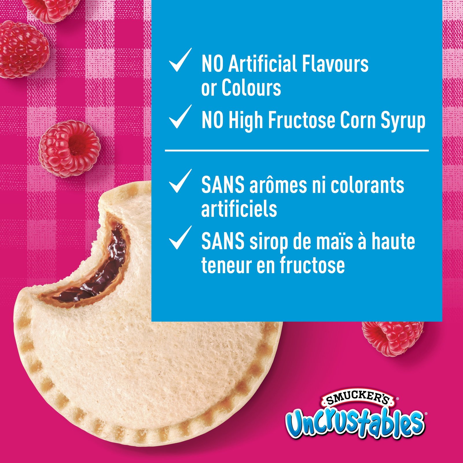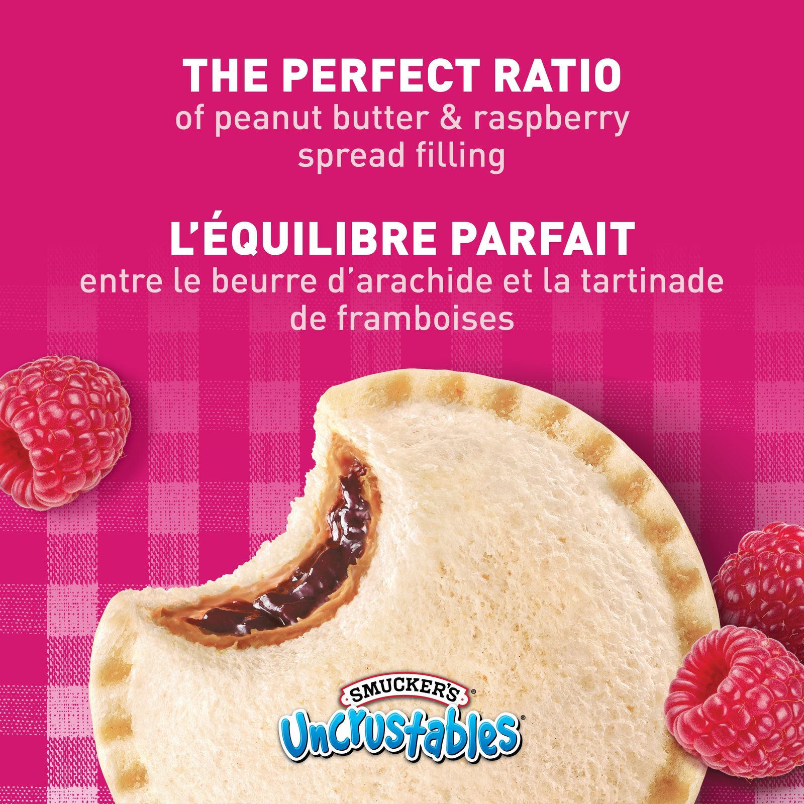 | Ingredients | Bread with 6.2% of whole wheat flour (wheat. barley). Peanut butter: Peanuts. Sugars (sugar. cooking molasses). Peanut oil. Hydrogenated vegetable oil. Salt. Mono and diglycerides. Raspberry spread: Sugar. Raspberries. Water. Pectin. Citric acid. Natural flavours. Potassium sorbate. Mono and diglycerides. Contains: Barley. Peanuts. Wheat. May contain: Hazelnut. Milk. Mustard. Oat. Rye. Soybean. Triticale. |